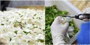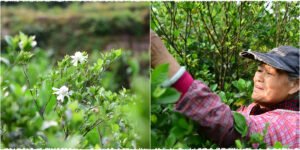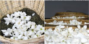 Tea farmers will clean the well-picked gardenia flowers, cut off the flower diameter, leaving only the white flowers; and then spread the flowers on the tea leaves, letting them to slowly absorb the fragrance of the flowers. During this period, the tea leaves need to be turned over and the flowers need to be replaced. The whole process will be repeated many times until the fragrance of the flowers completely integrate into the tea leaves. Usually, it takes half a month from picking flowers to completing the scenting process, and making 500g tea needs 2000g-5000g fresh flowers.